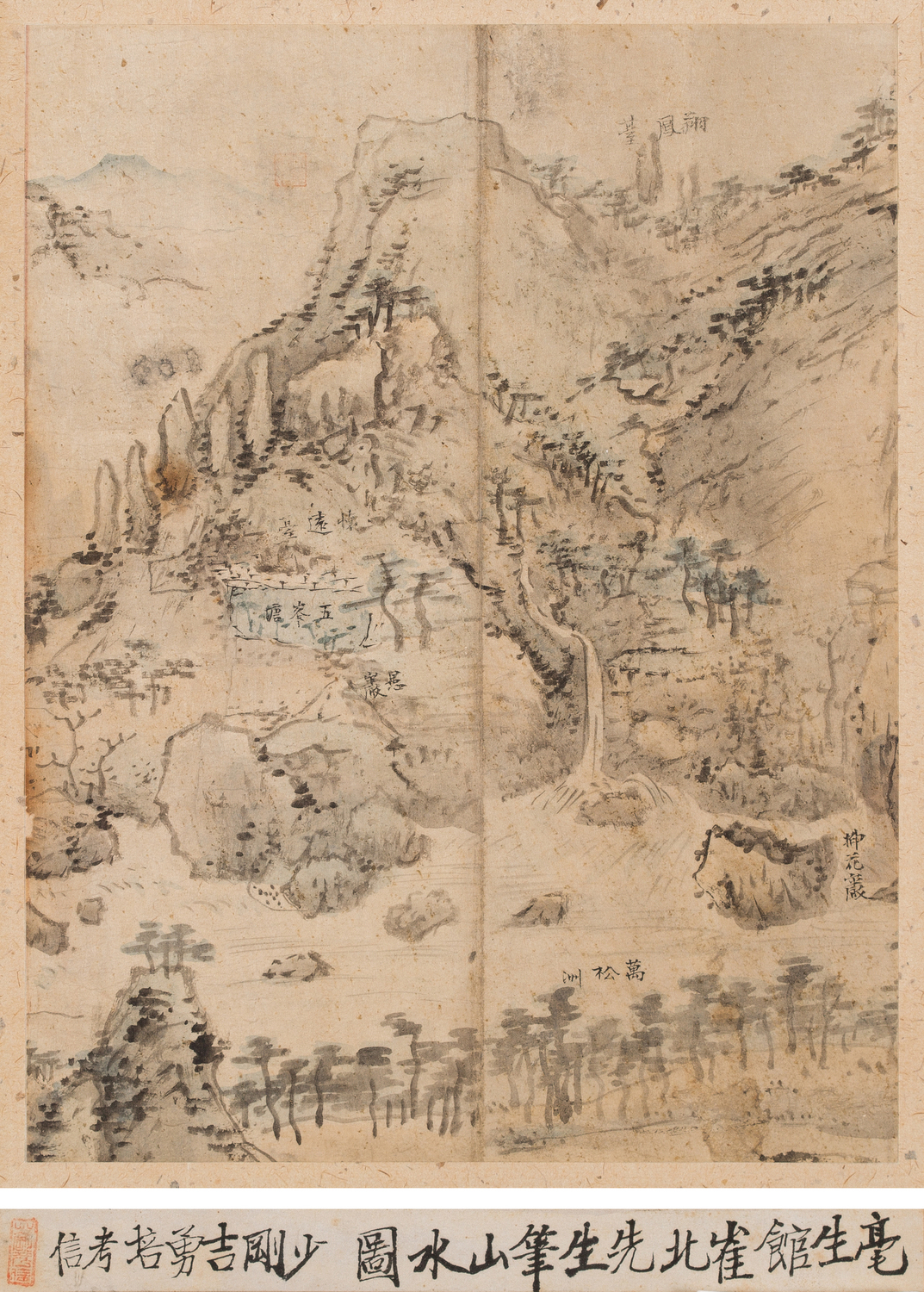 작품의 하단부에는 근대기의 서화 소장가로 추정되는 소강 길용배少剛 吉勇培가 쓴 ‘毫生館崔北先生筆山水圖’라는 배관기가 붙어있다.